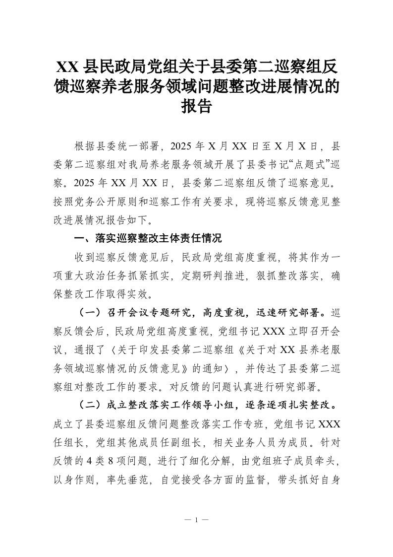 首页精选范文XX县民政局党组关于县委第二巡察组反馈巡察养老服务领域问题整改进展情况的报告