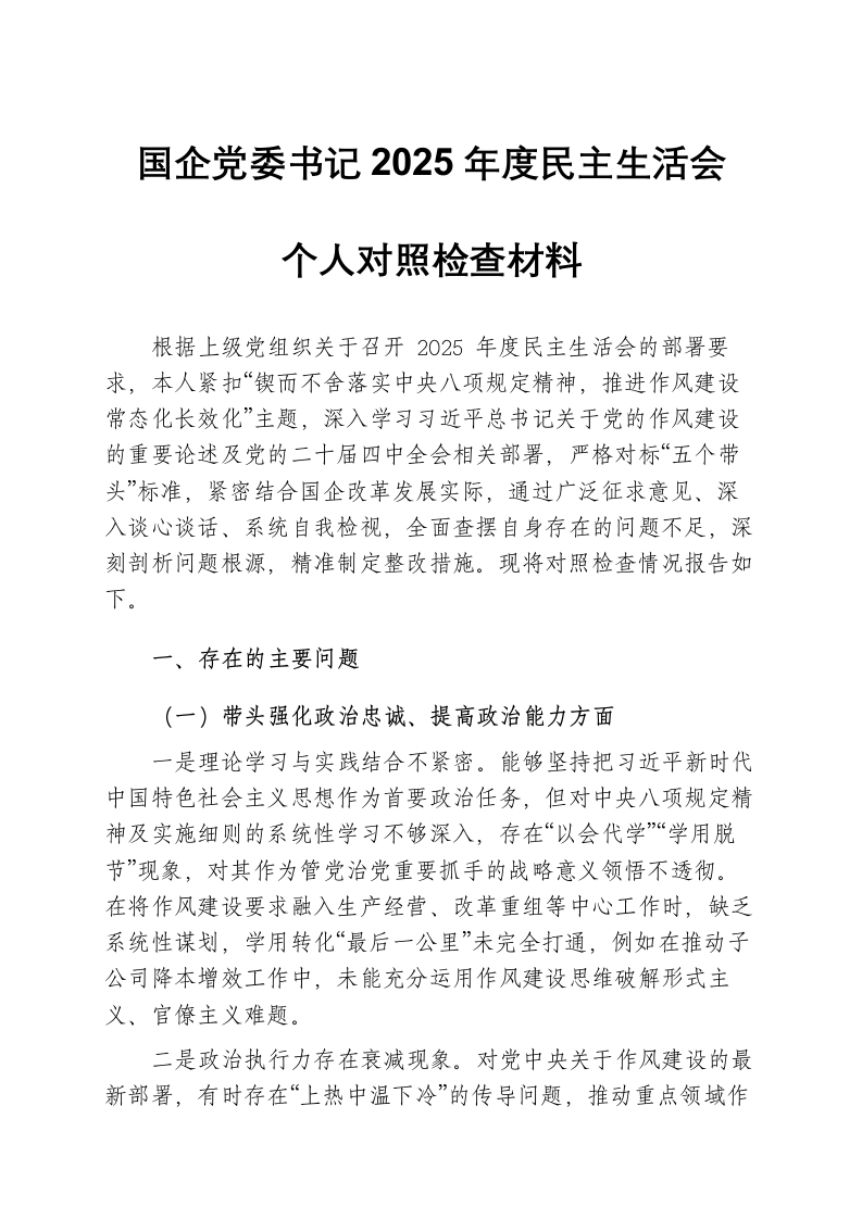 首页精选范文国企党委书记2025年度民主生活会个人对照检查材料