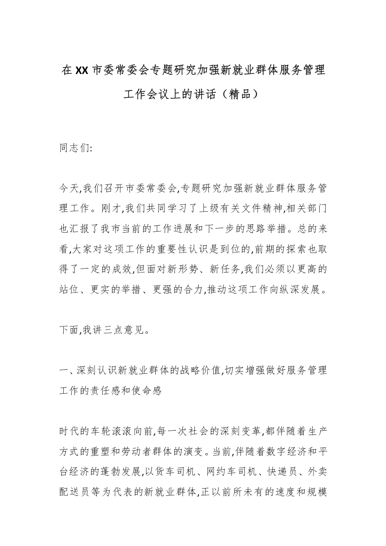 首页精选范文在XX市委常委会专题研究加强新就业群体服务管理工作会议上的讲话(精品)_副本