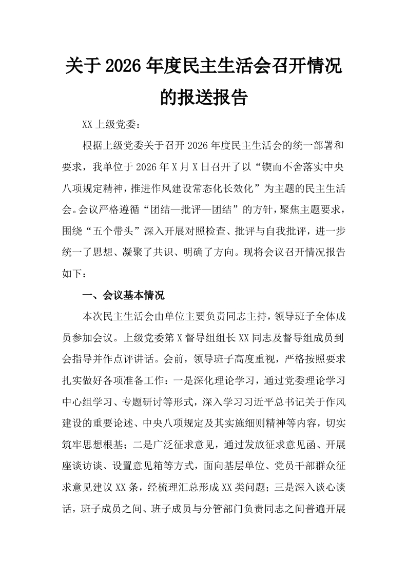 关于2026年度民主生活会召开情况的报送报告