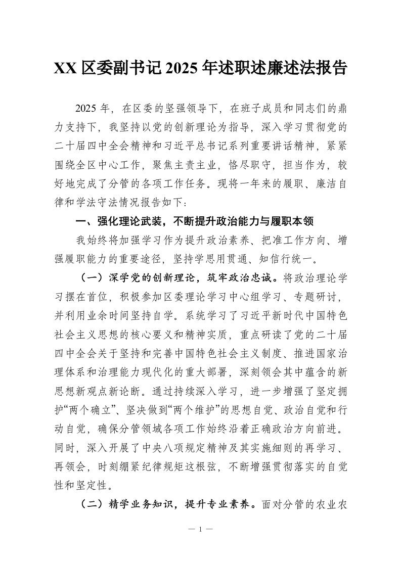 XX区委副书记2025年述职述廉述法报告