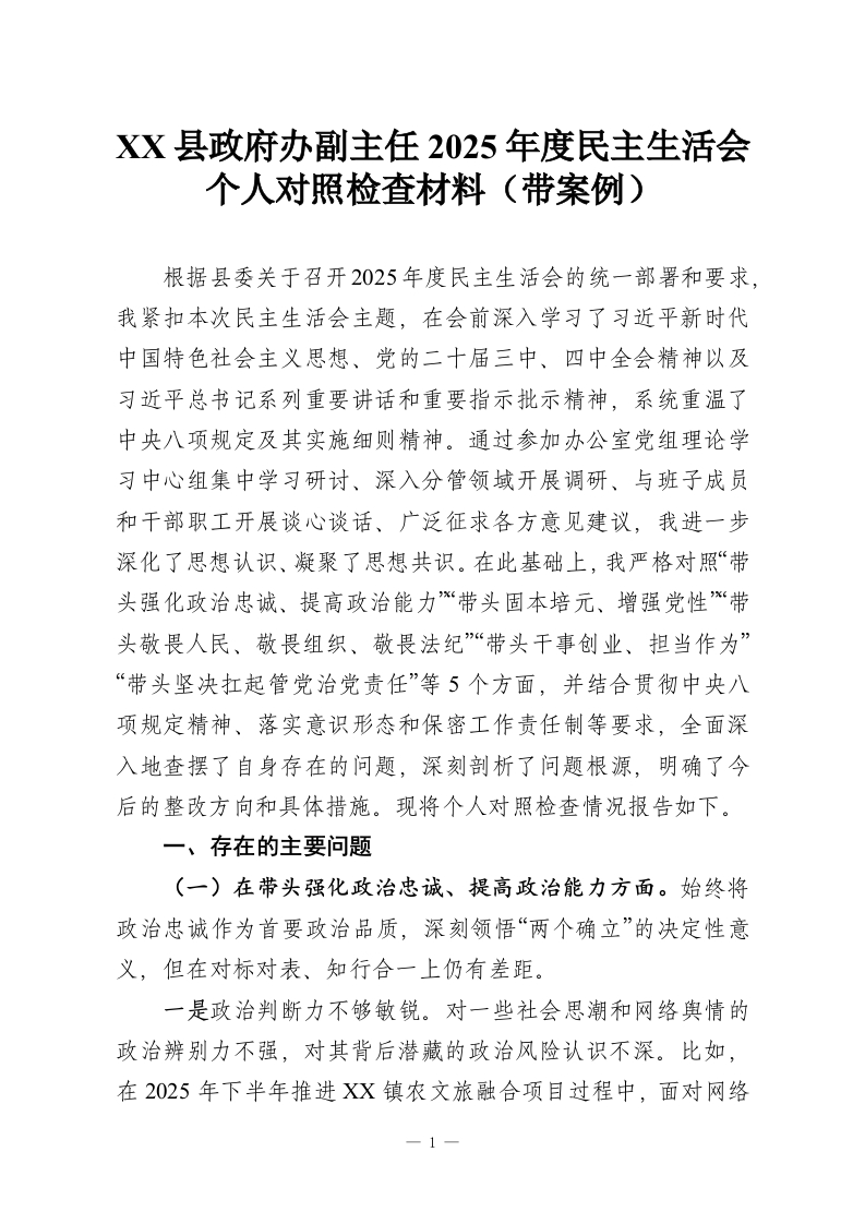 XX县***办副主任2025年度民主生活会个人对照检查材料(带案例)