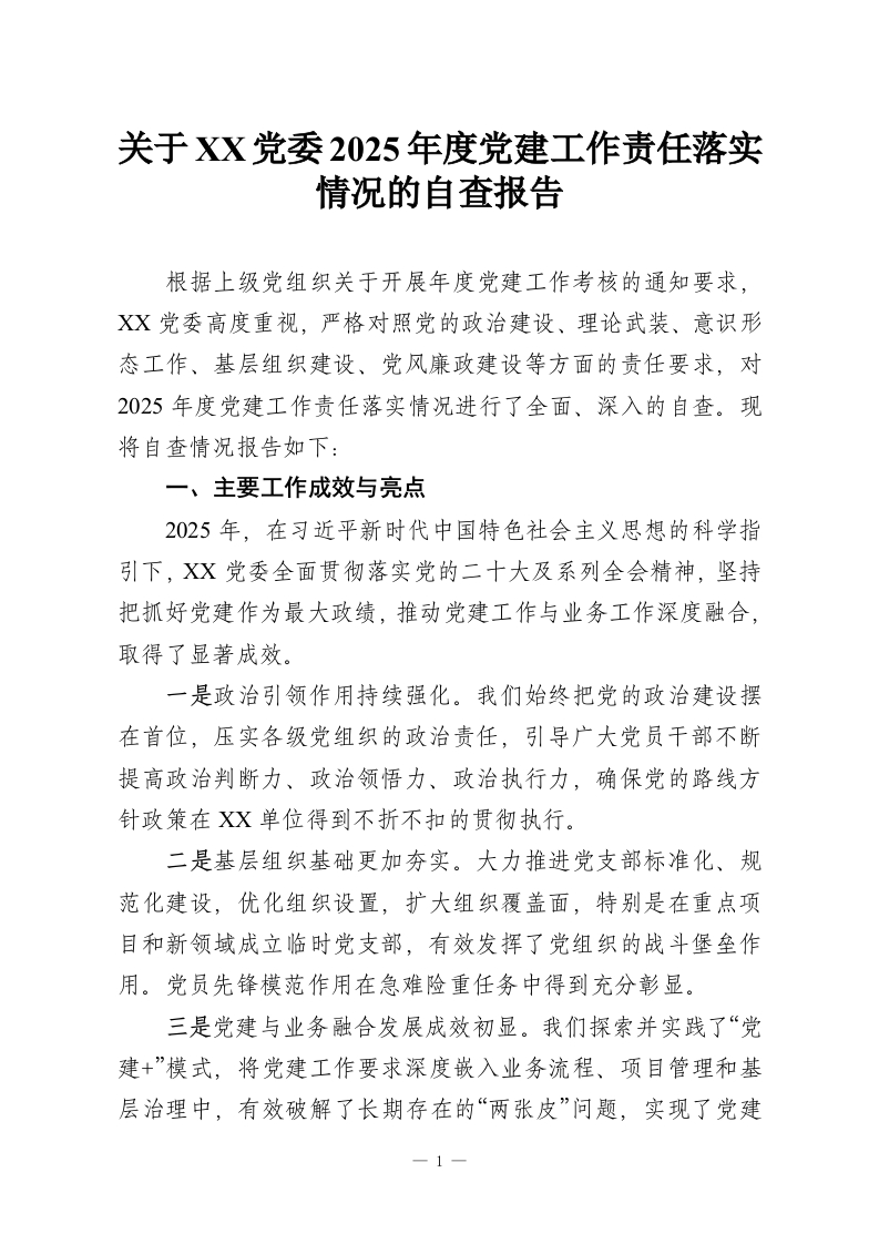 关于XX党委2025年度党建工作责任落实情况的自查报告