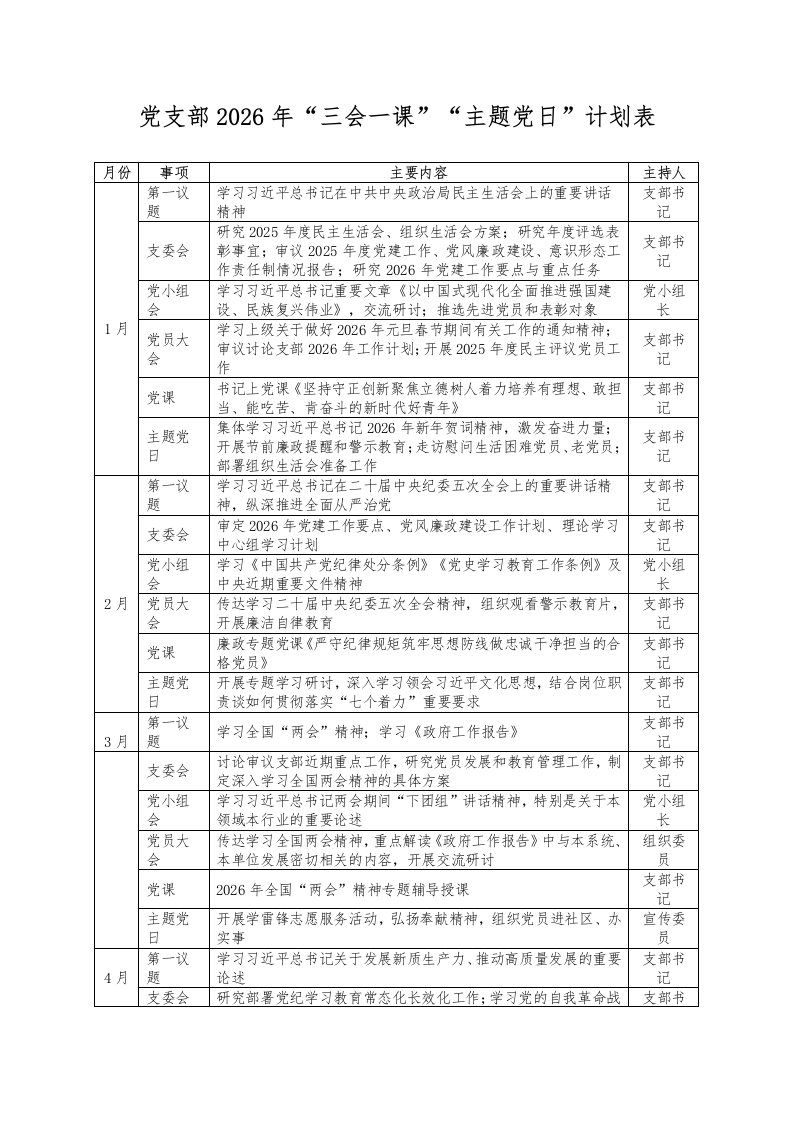 党支部2026年“三会一课”“主题党日”计划表