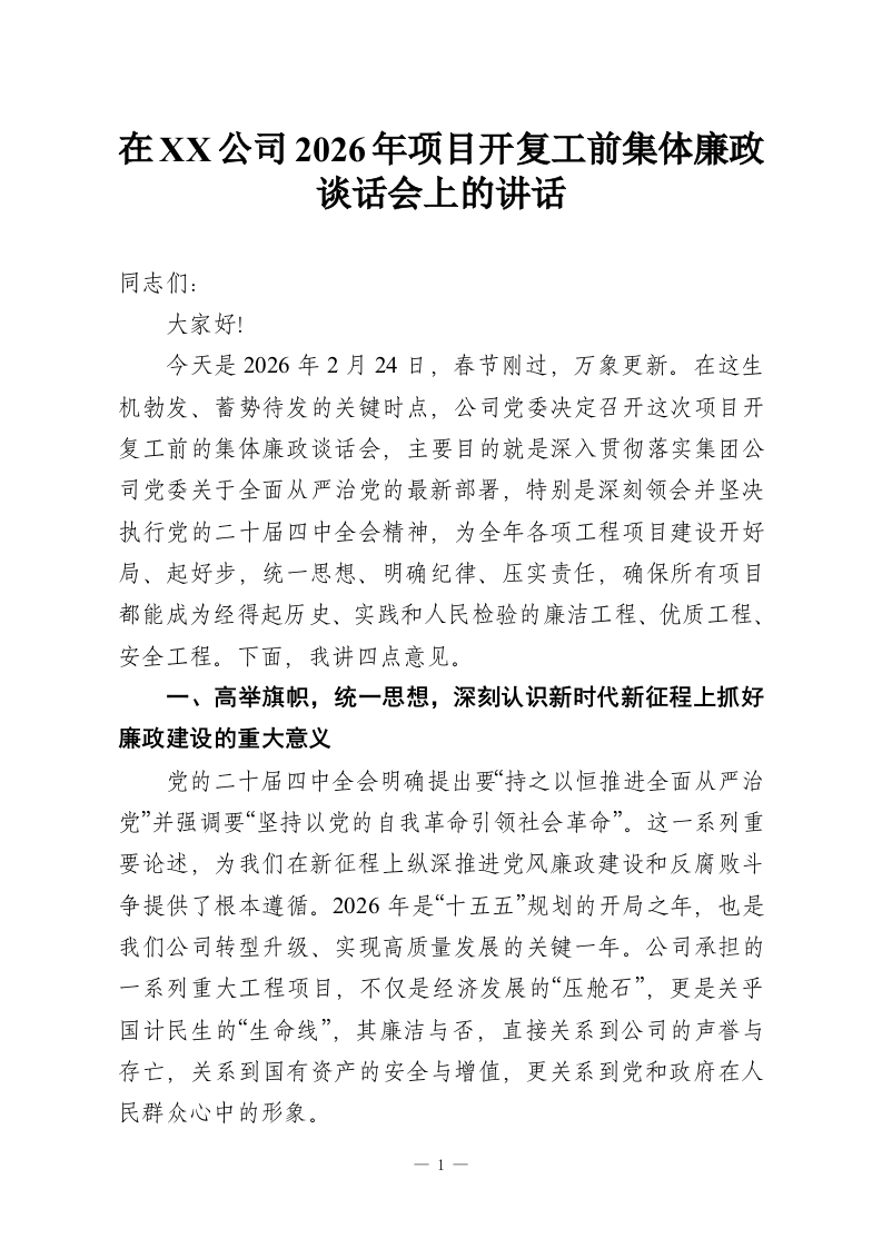 首页讲课讲稿在XX公司2026年项目开复工前集体廉政谈话会上的讲话