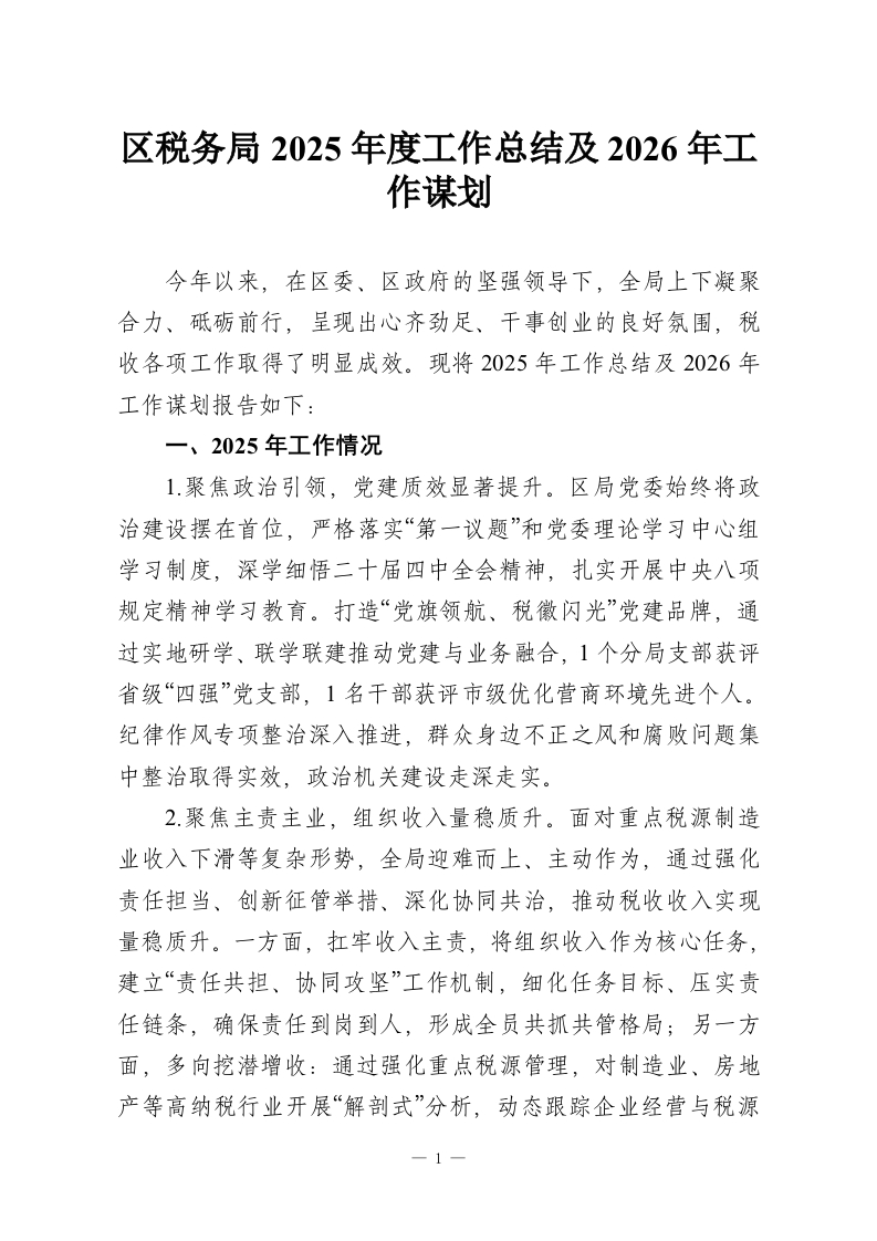 首页讲课讲稿区税务局2025年度工作总结及2026年工作谋划