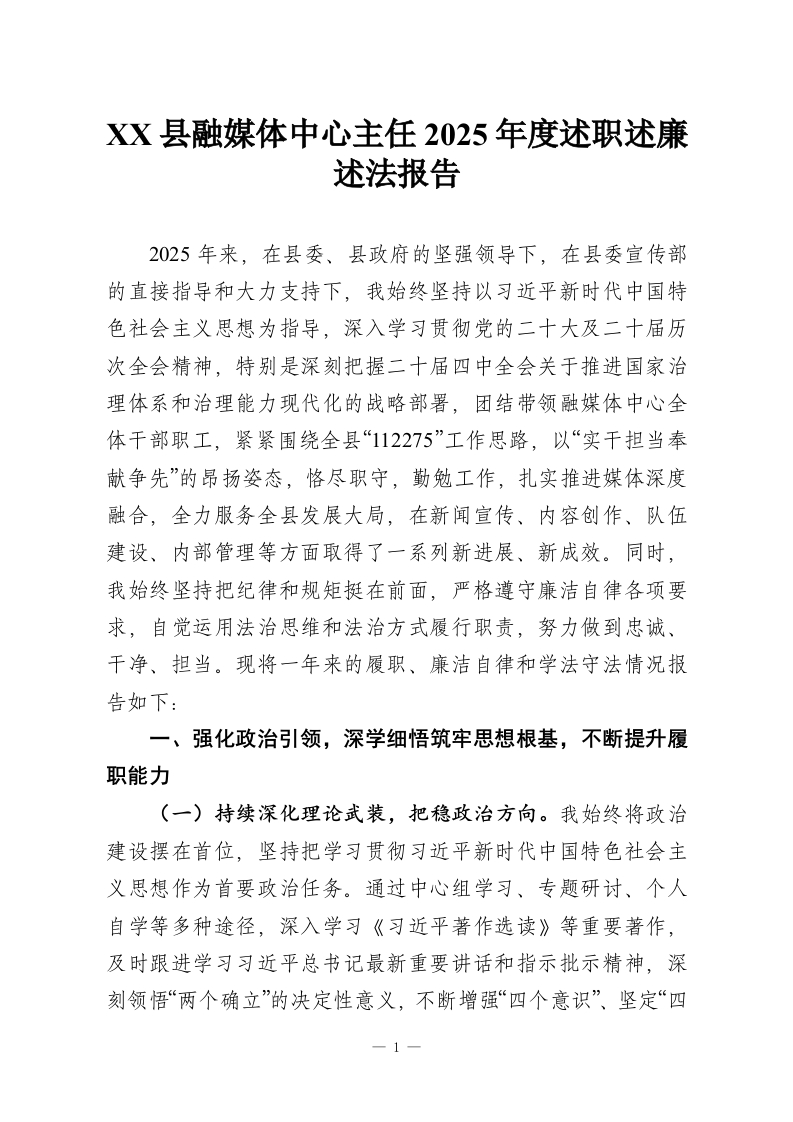 XX县融媒体中心主任2025年度述职述廉述法报告