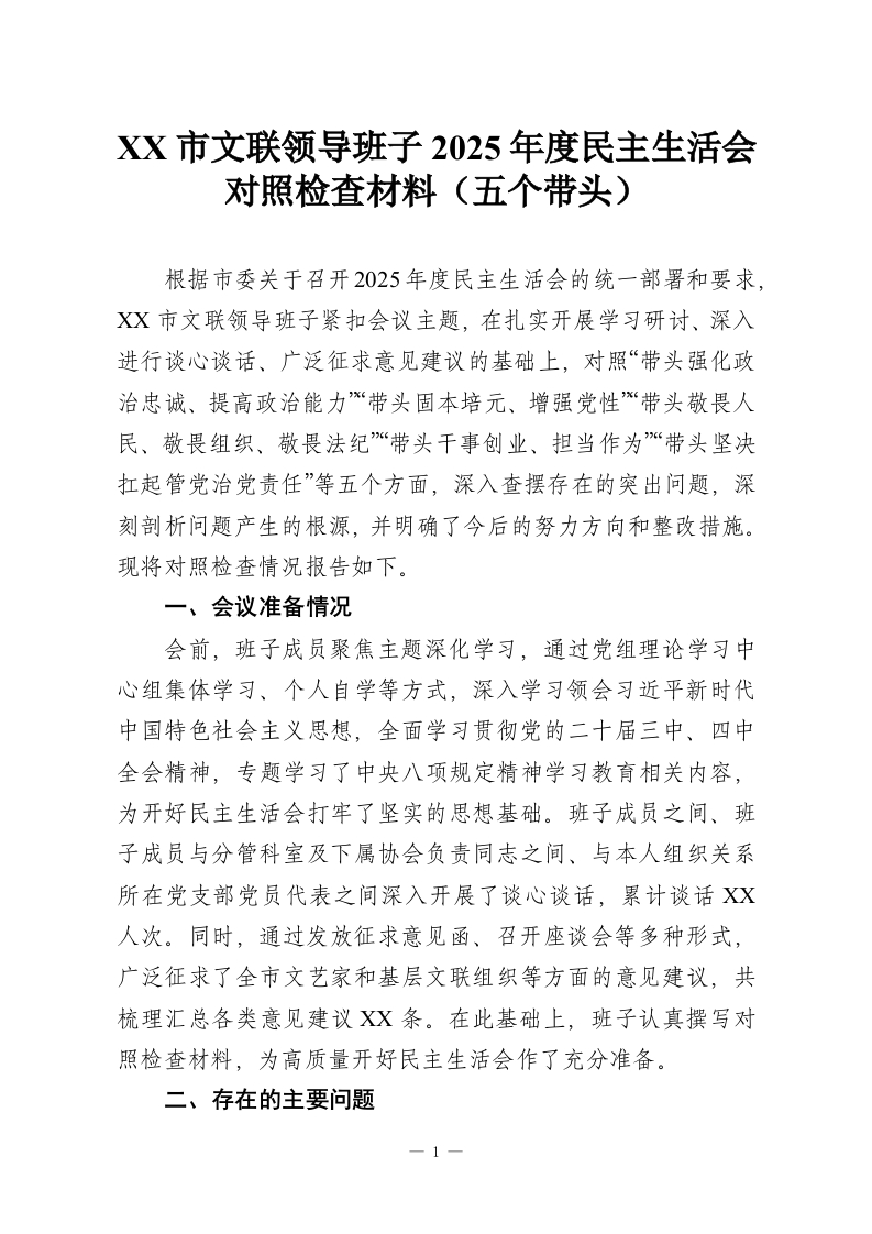 XX市文联领导班子2025年度民主生活会对照检查材料(五个带头)