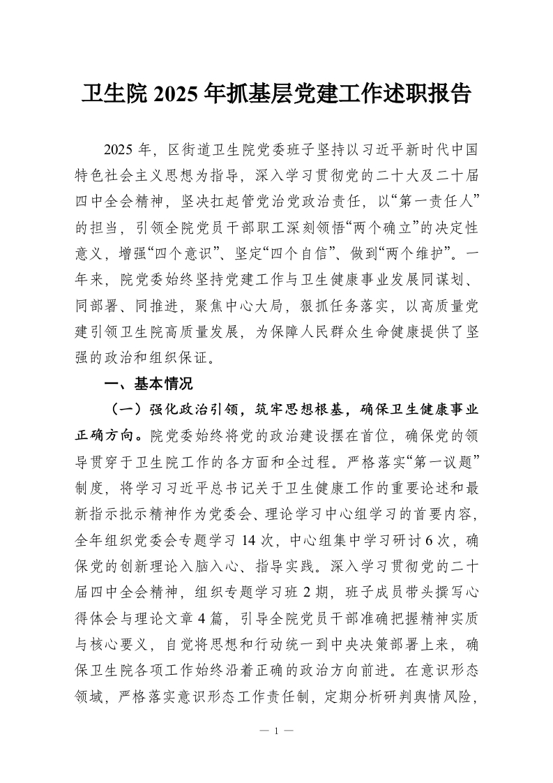 卫生院2025年抓基层党建工作述职报告