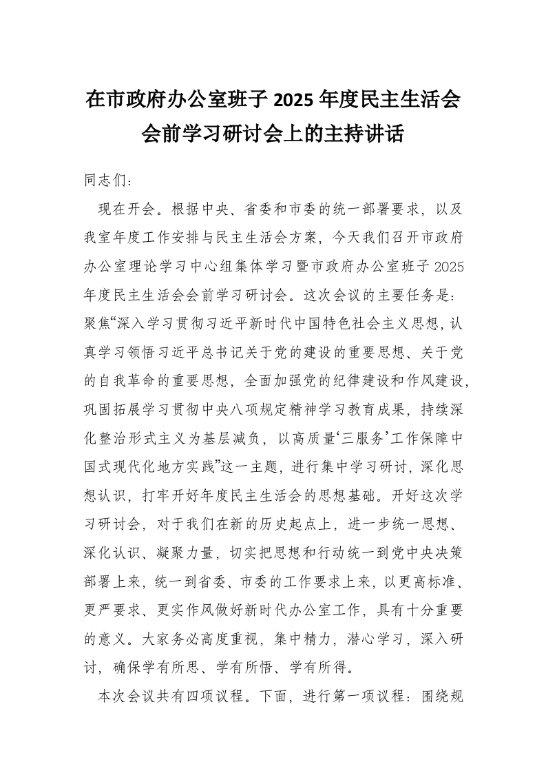 在市***办公室班子2025年度民主生活会会前学习研讨会上的主持讲话