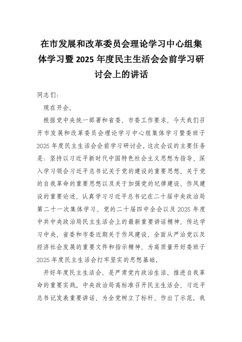 在市发展和改革委员会理论学习中心组集体学习暨2025年度民主生活会会前学习研讨会上的讲话