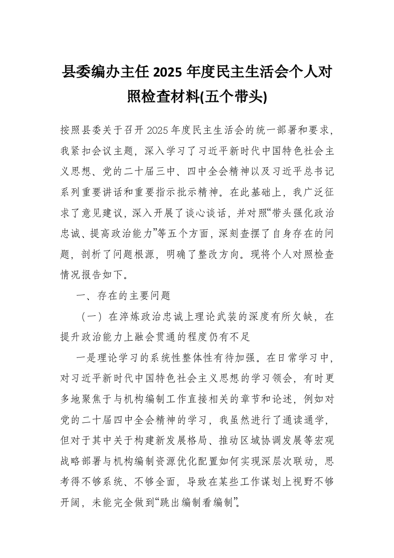县委编办主任2025年度民主生活会个人对照检查材料(五个带头)