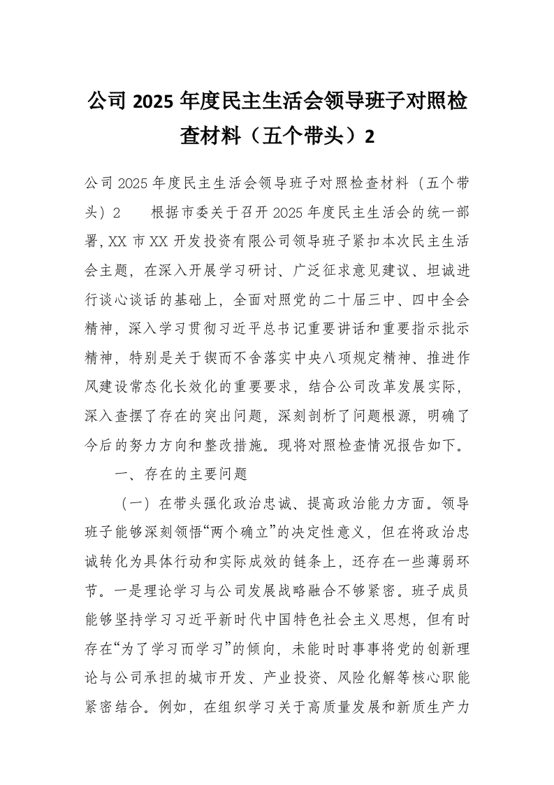 首页学习提升公司2025年度民主生活会领导班子对照检查材料(五个带头)2