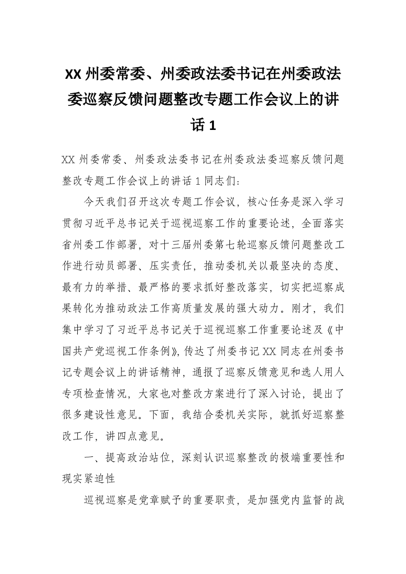 XX州委常委、州委政法委书记在州委政法委巡察反馈问题整改专题工作会议上的讲话1