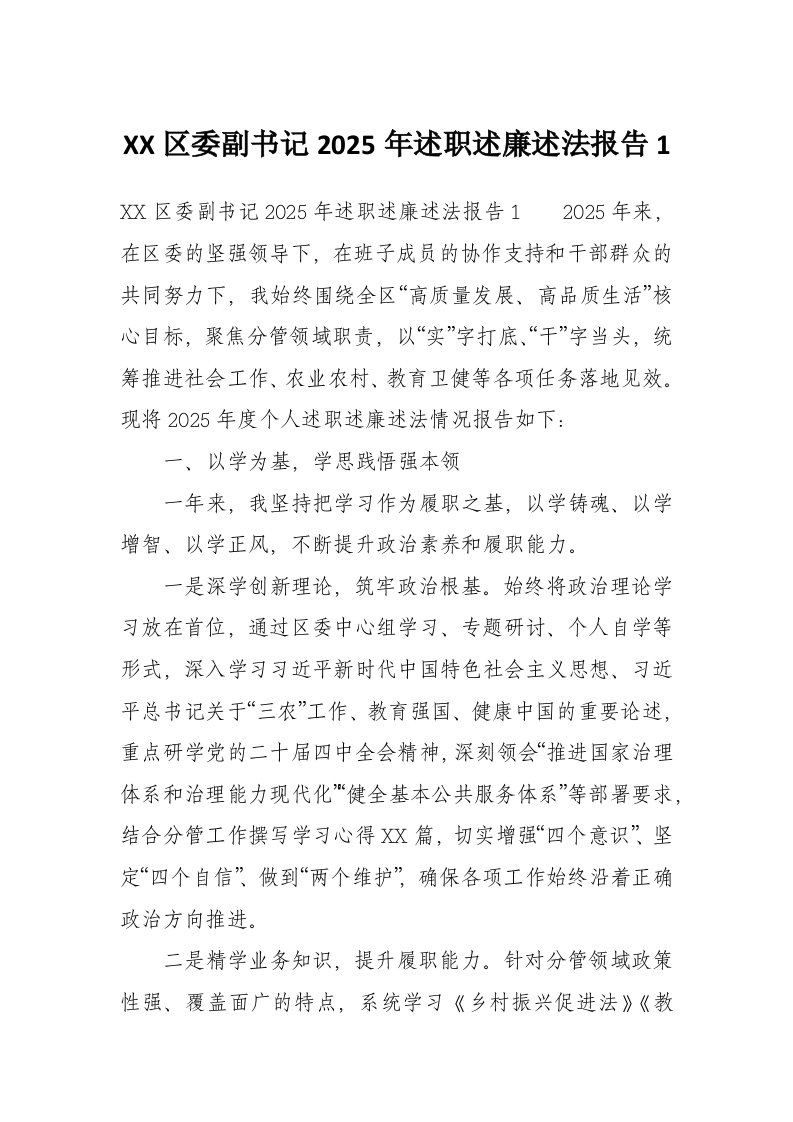 XX区委副书记2025年述职述廉述法报告1