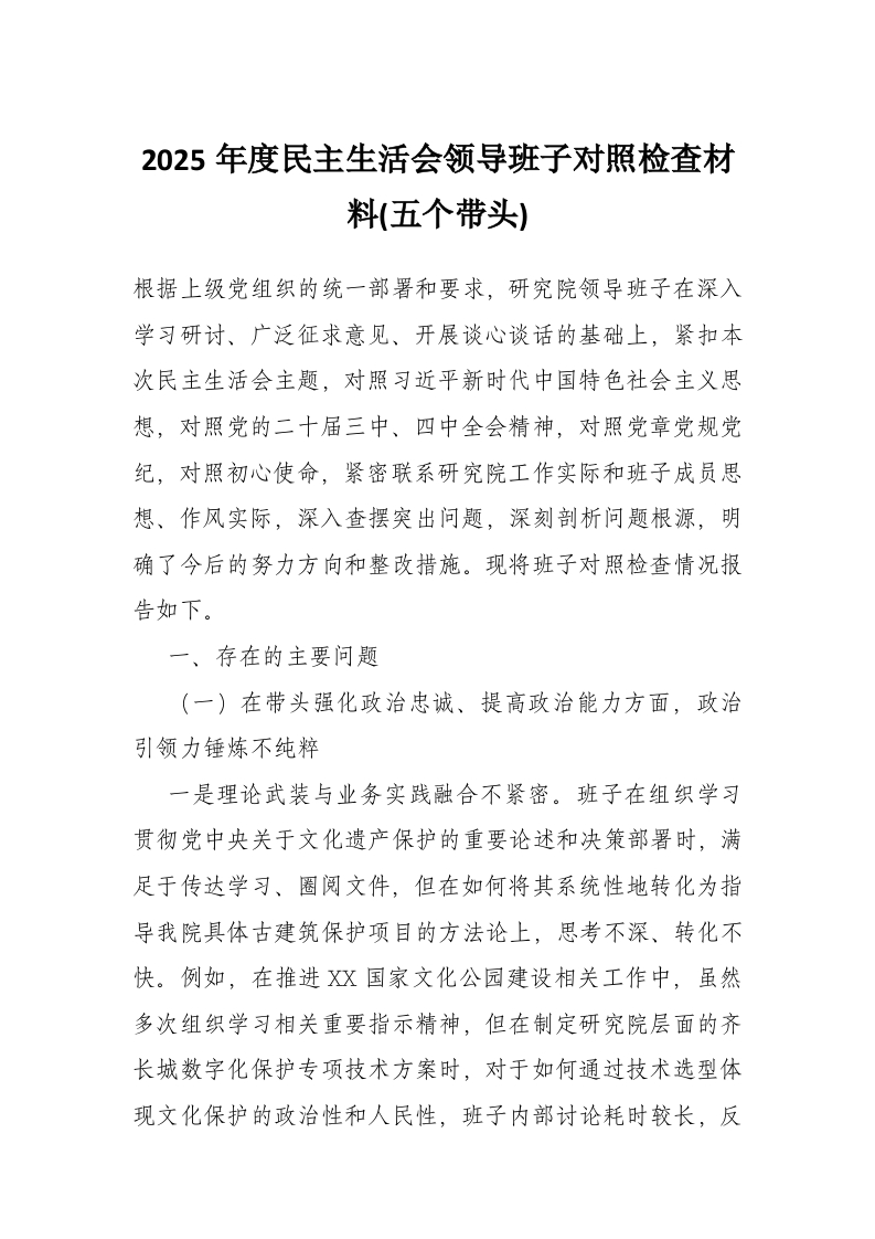 2025年度民主生活会领导班子对照检查材料(五个带头)