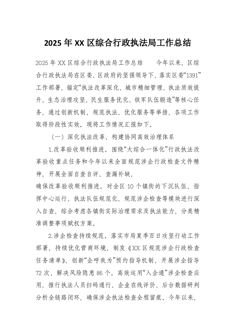 2025年XX区综合行政执法局工作总结