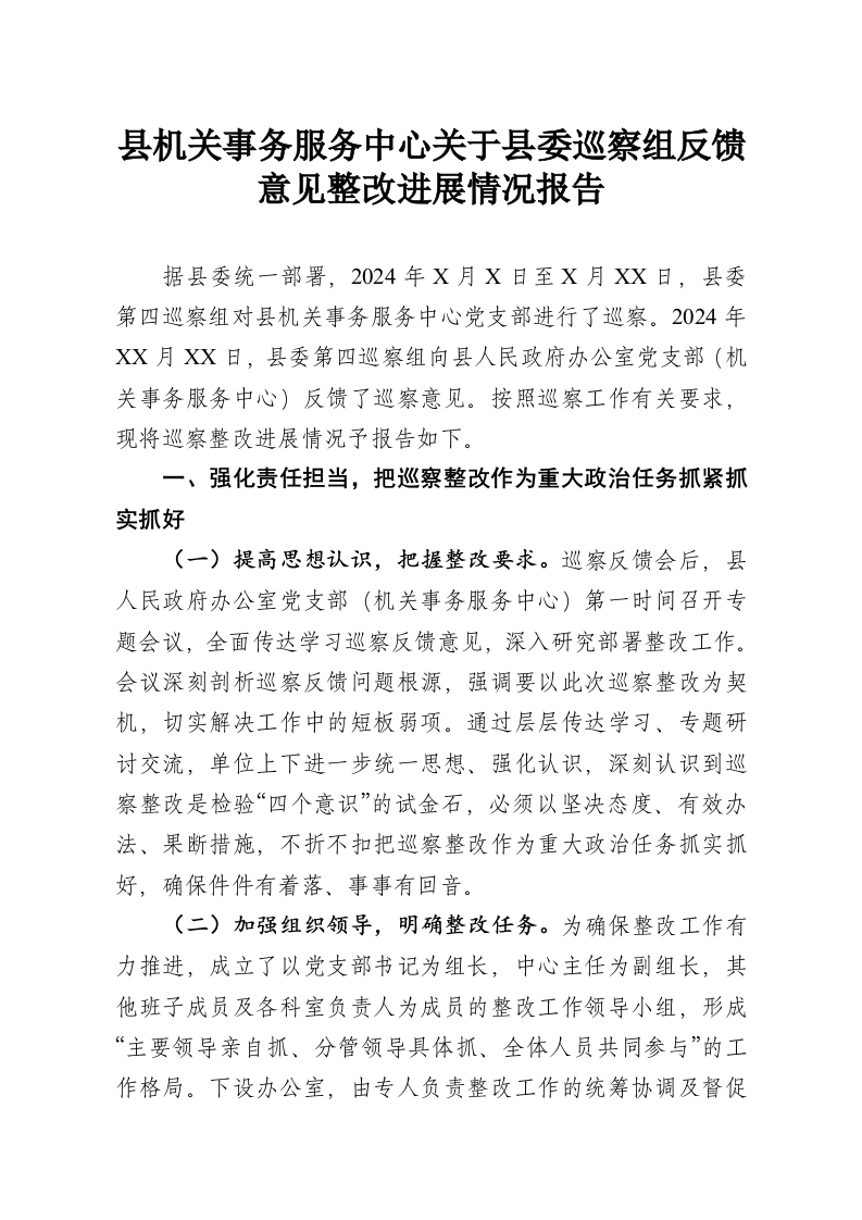 县机关事务服务中心关于县委巡察组反馈意见整改进展情况报告