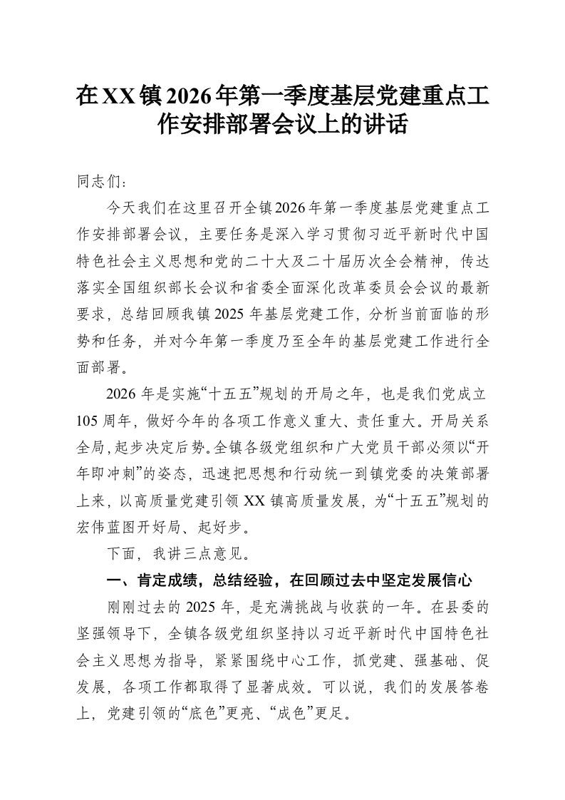 在XX镇2026年第一季度基层党建重点工作安排部署会议上的讲话
