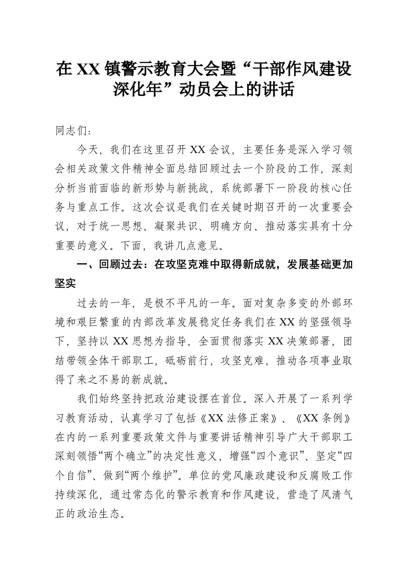 在XX镇警示教育大会暨“干部作风建设深化年”动员会上的讲话
