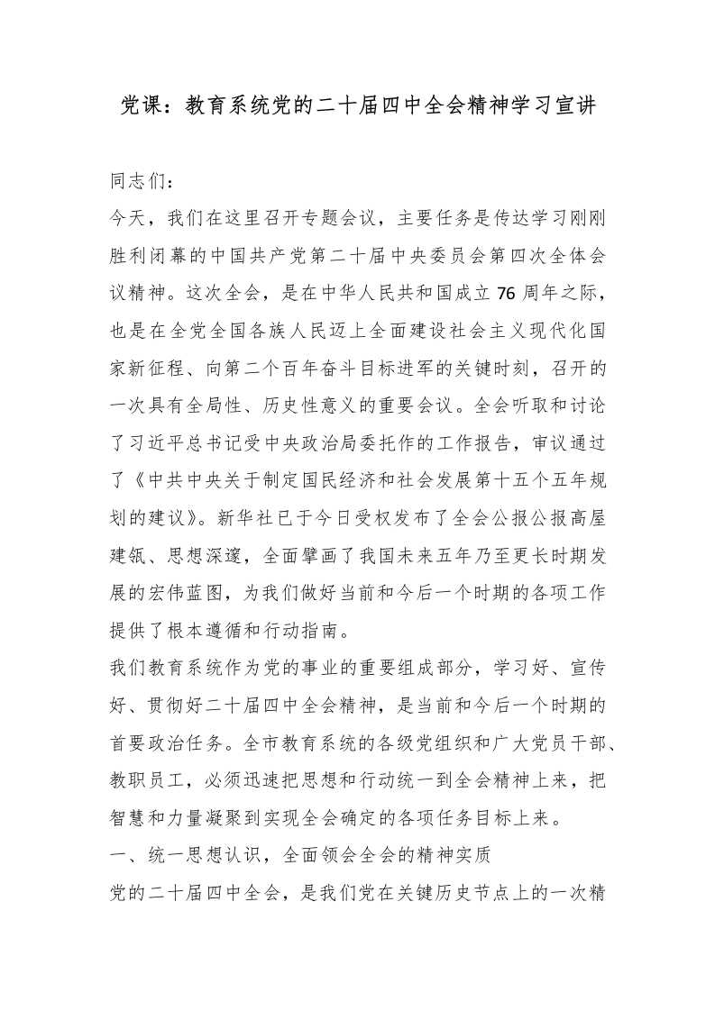 党课:教育系统党的二十届四中***精神学习宣讲