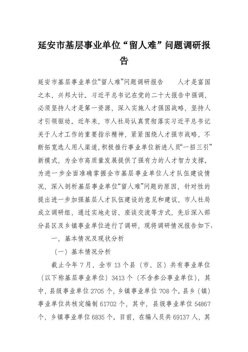 首页材料汇编延安市基层事业单位“留人难”问题调研报告