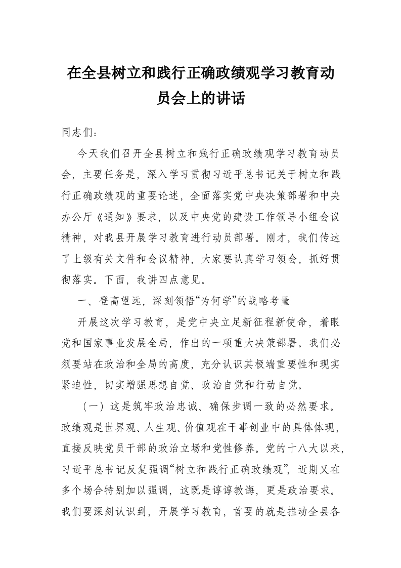 在全县树立和践行正确政绩观学习教育动员会上的讲话