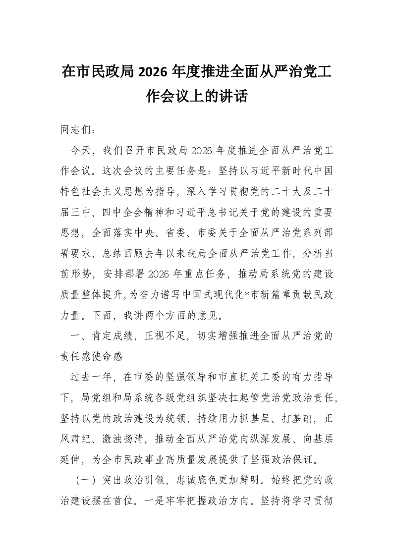 在市民政局2026年度推进全面从严治党工作会议上的讲话