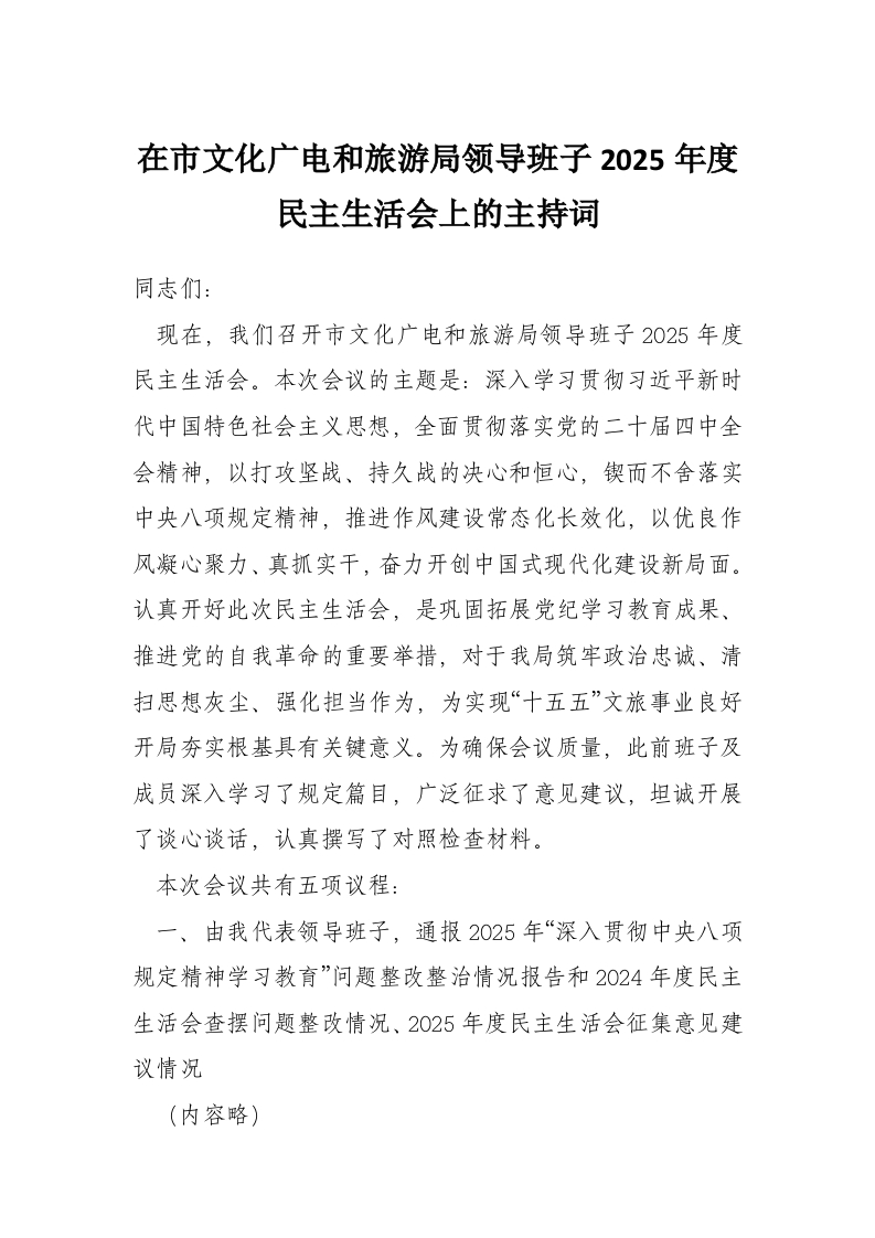 在市文化广电和旅游局领导班子2025年度民主生活会上的主持词