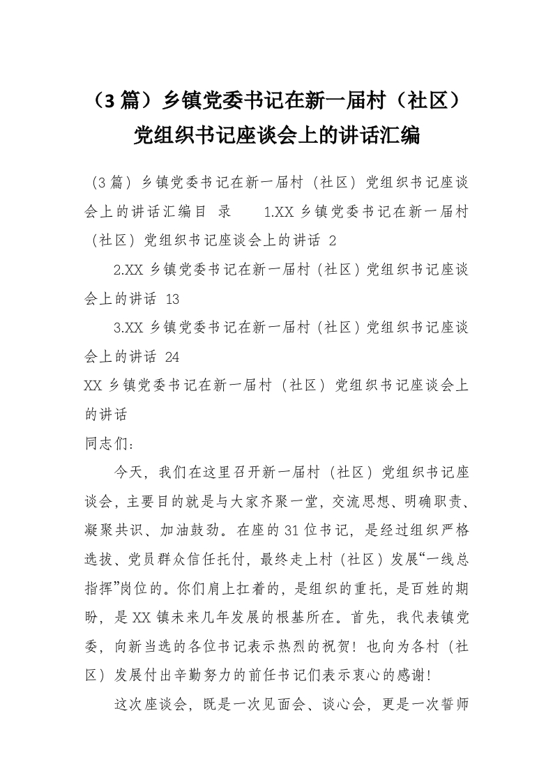 (3篇)乡镇党委书记在新一届村(社区)党组织书记座谈会上的讲话汇编
