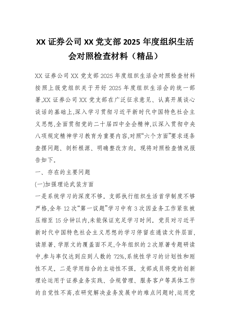 XX证券公司XX党支部2025年度组织生活会对照检查材料(精品)