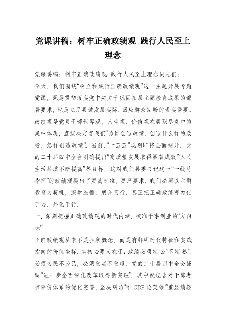 党课讲稿:树牢正确政绩观 践行人民至上理念