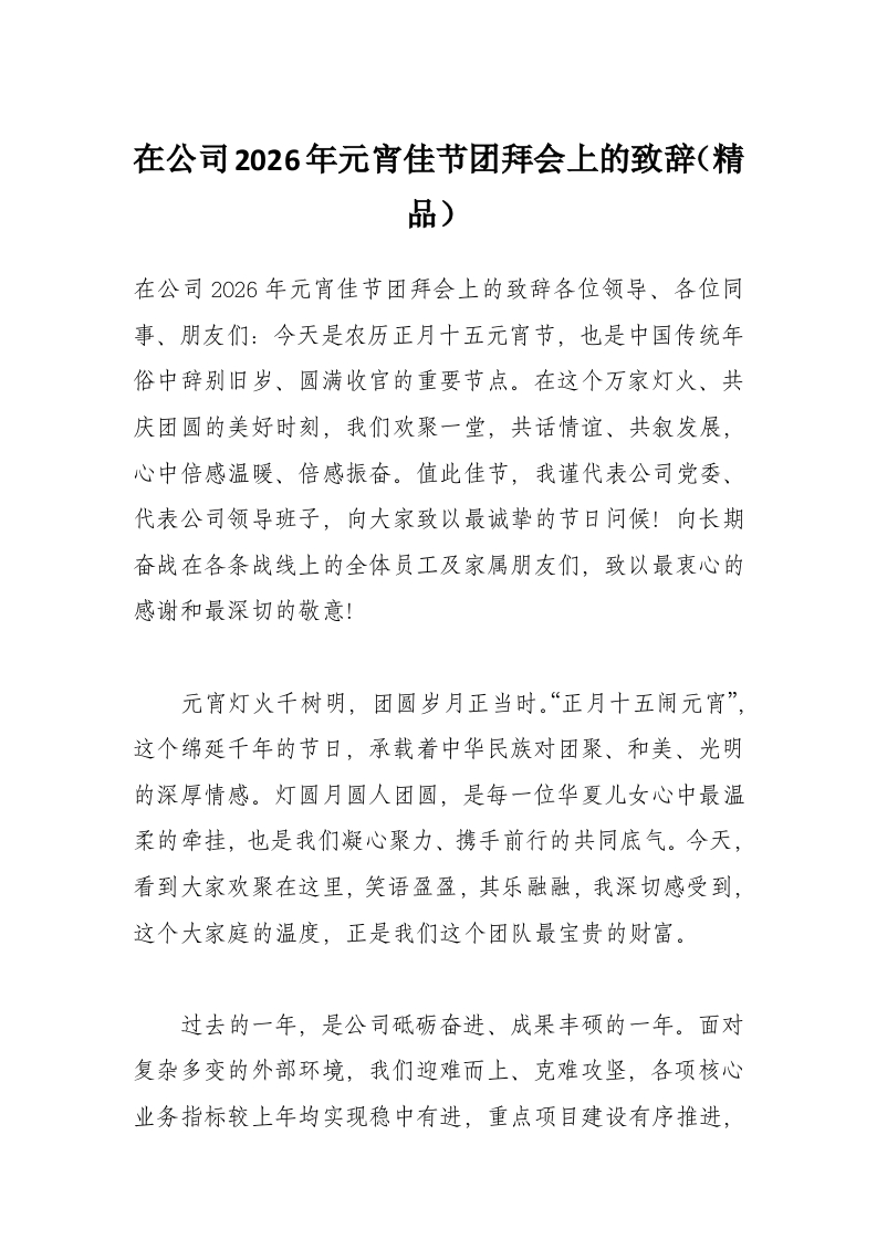 在公司2026年元宵佳节团拜会上的致辞(精品)