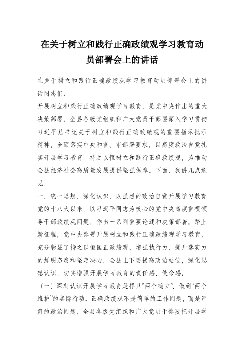 在关于树立和践行正确政绩观学习教育动员部署会上的讲话