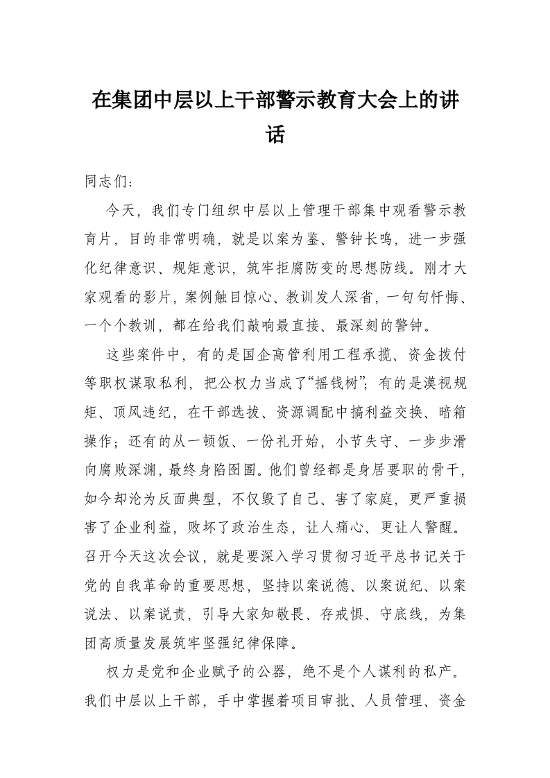 在集团中层以上干部警示教育大会上的讲话