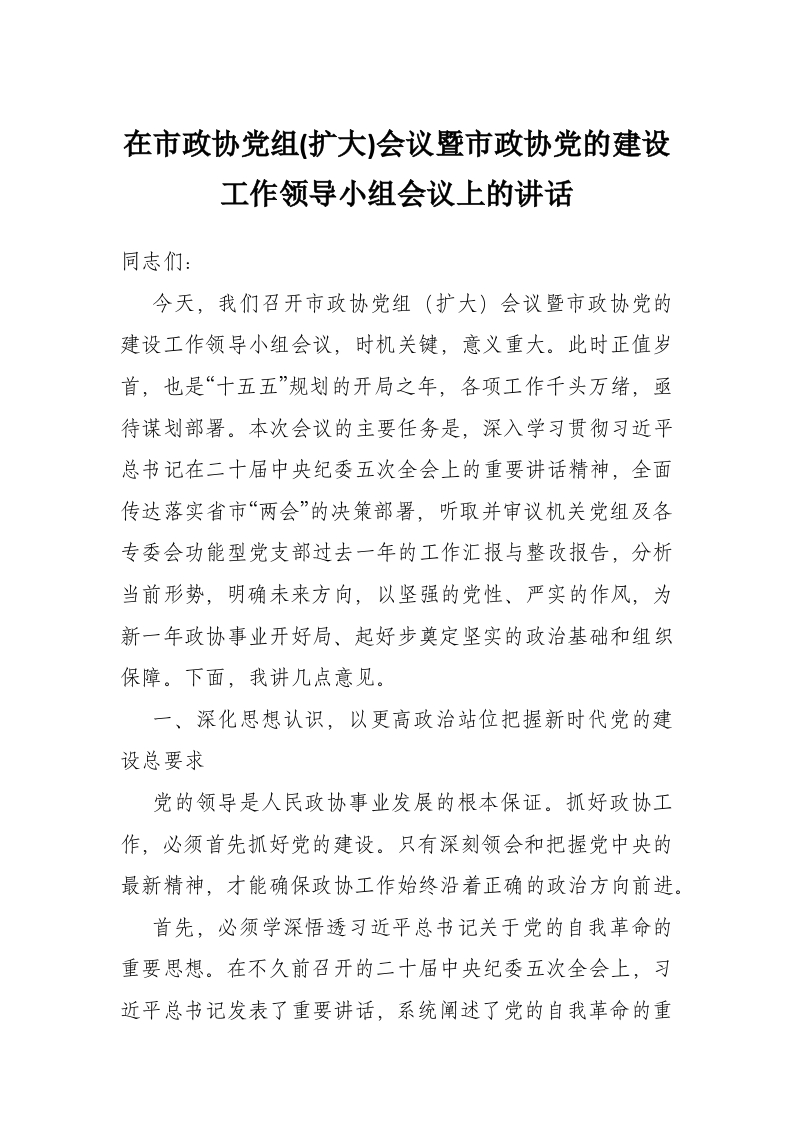 在市政协党组(扩大)会议暨市政协党的建设工作领导小组会议上的讲话