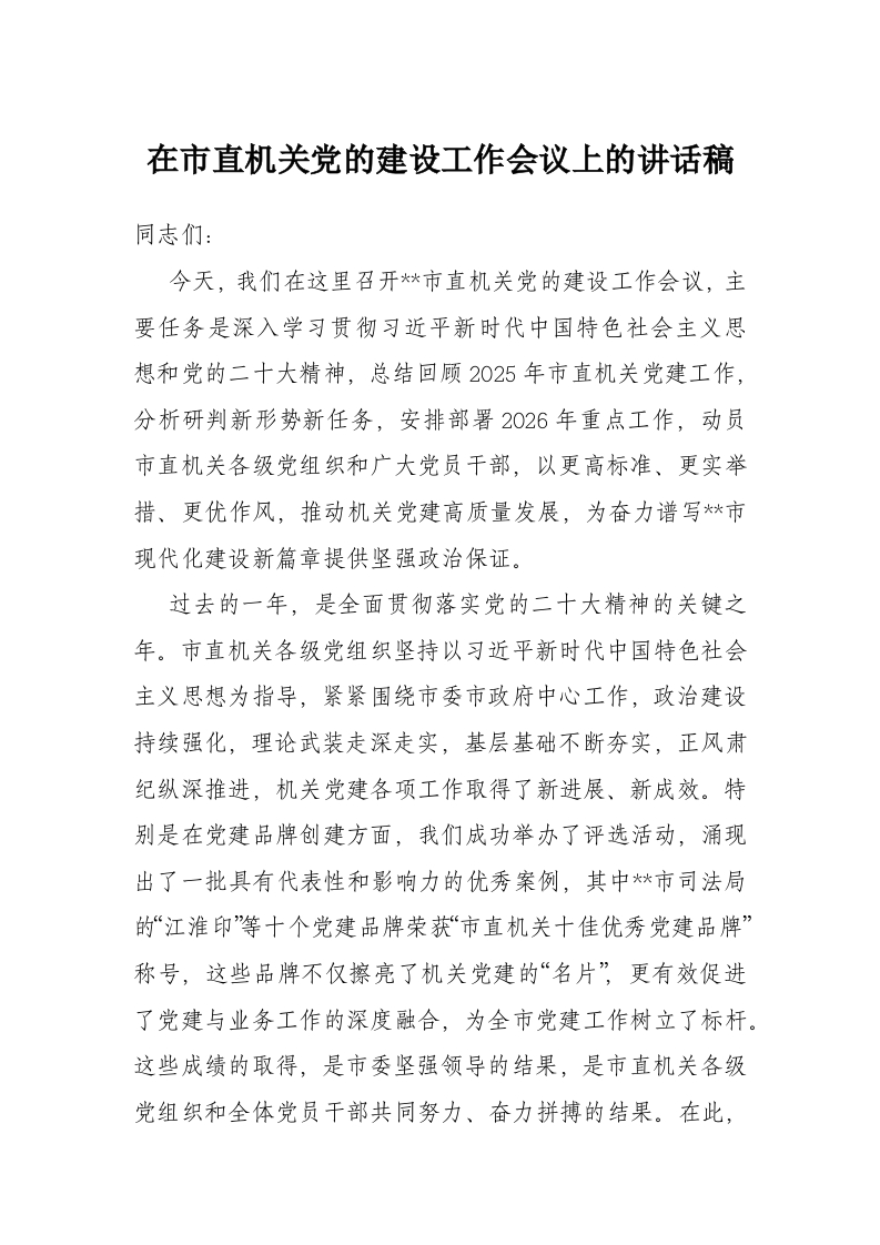 首页讲课讲稿在市直机关党的建设工作会议上的讲话稿