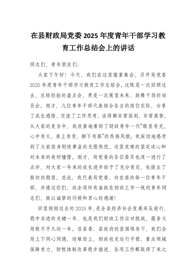 首页讲课讲稿在县财政局党委2025年度青年干部学习教育工作总结会上的讲话