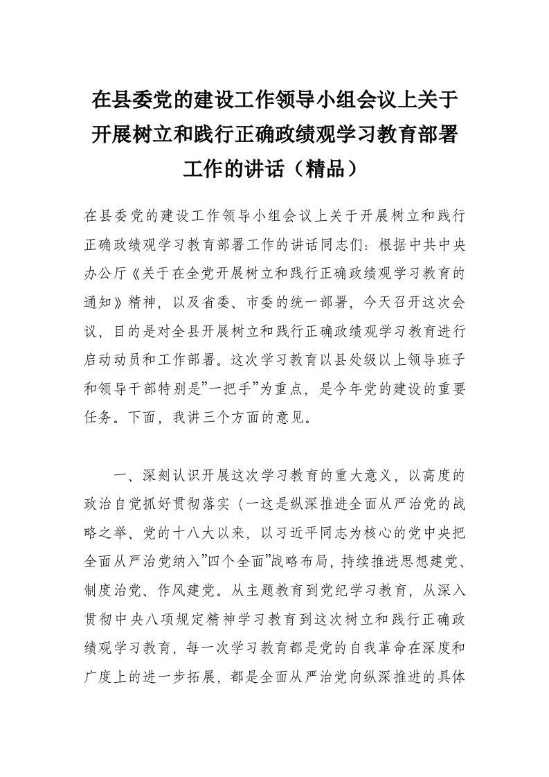 在县委党的建设工作领导小组会议上关于开展树立和践行正确政绩观学习教育部署工作的讲话(精品)