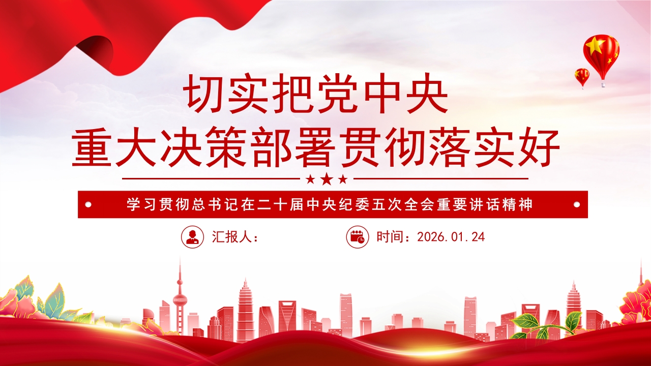 首页PPT模板简洁实用切实把党中央重大决策部署贯彻落实好PPT二十届中央纪委五次会议主题党课