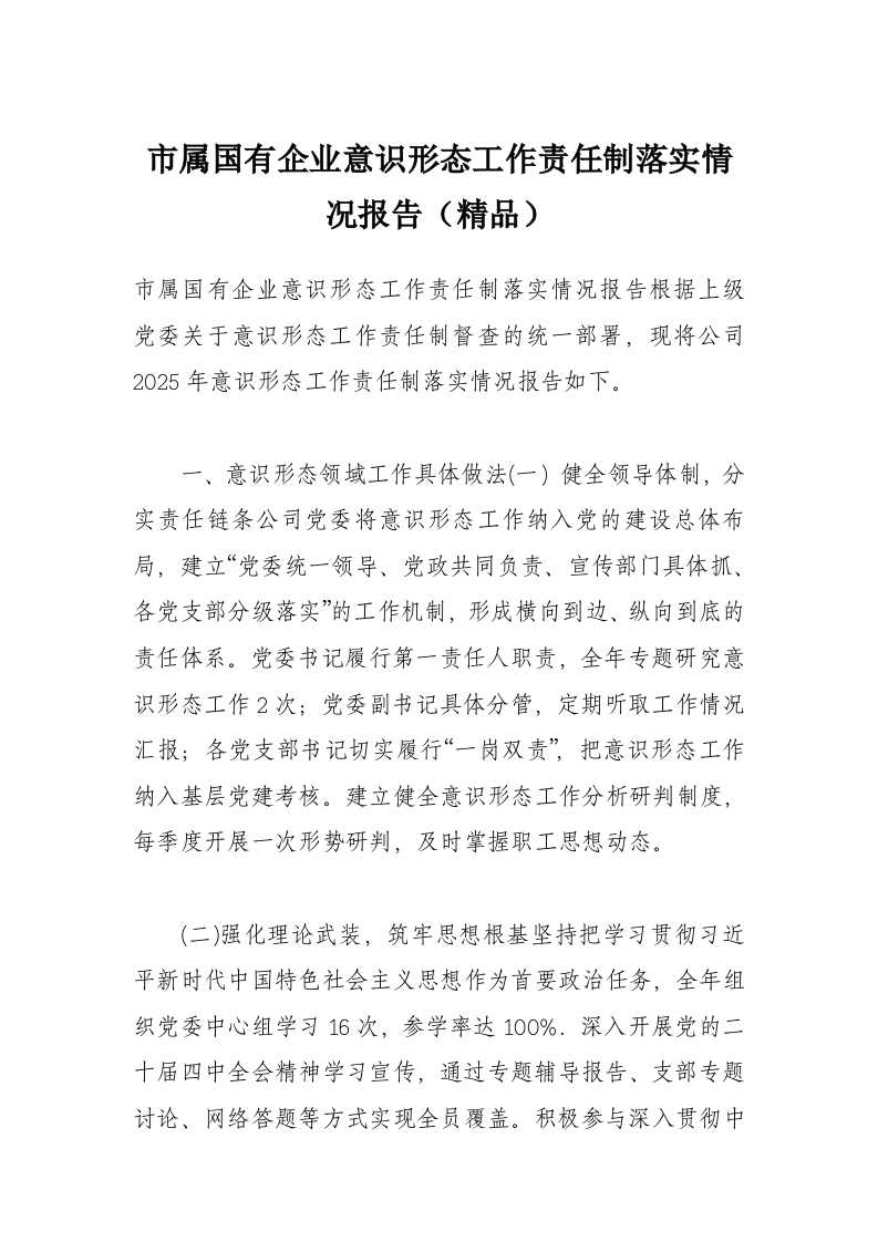 首页工作文档市属国有企业意识形态工作责任制落实情况报告(精品)