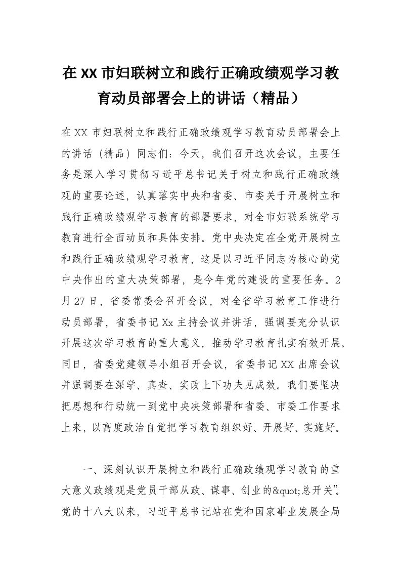 首页工作文档在XX市妇联树立和践行正确政绩观学习教育动员部署会上的讲话(精品)
