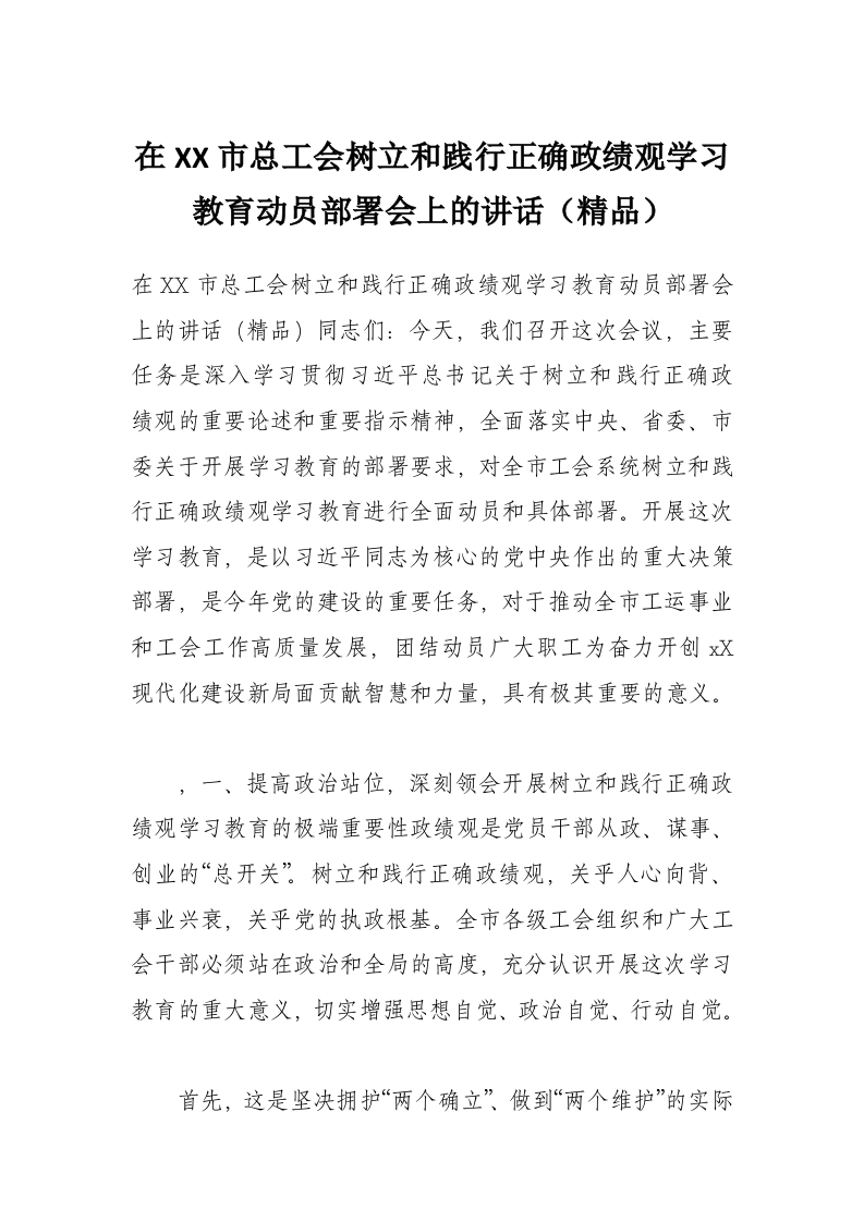 首页工作文档在XX市总工会树立和践行正确政绩观学习教育动员部署会上的讲话(精品)