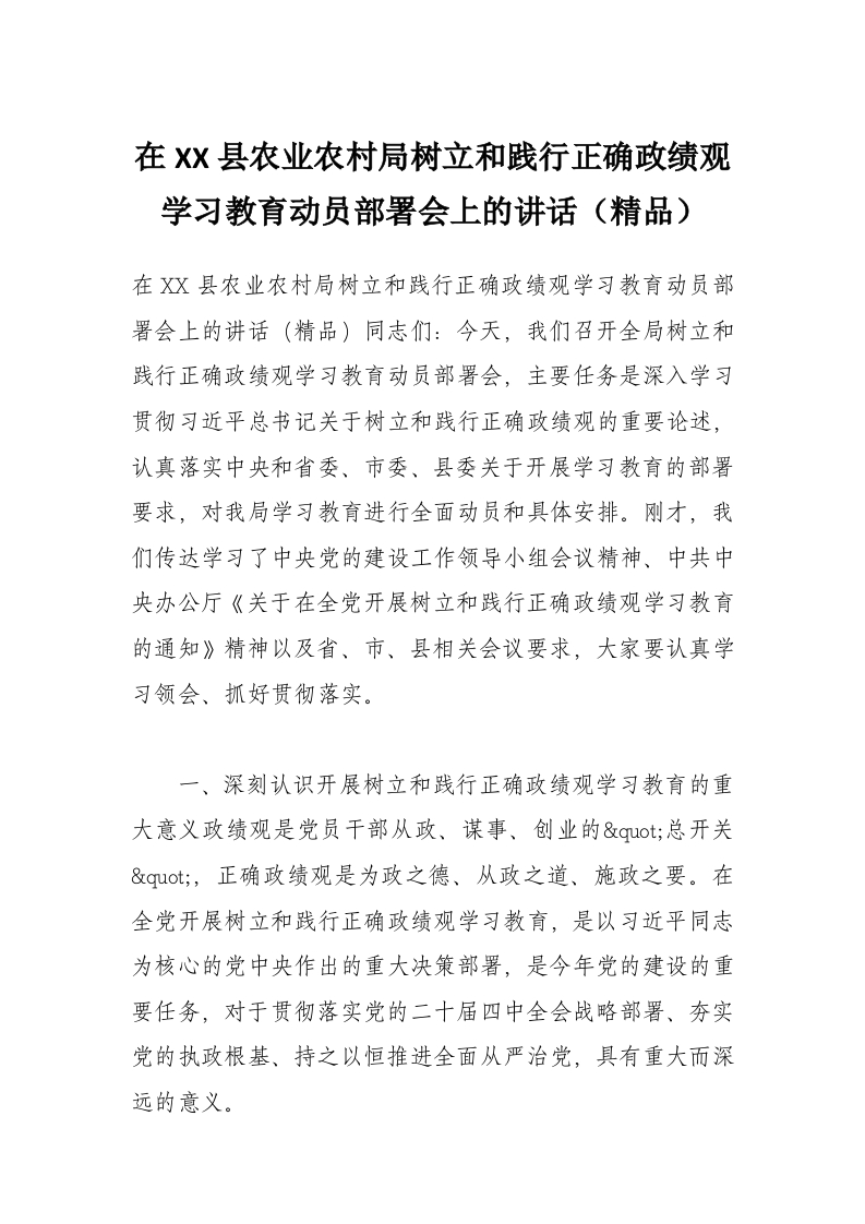 在XX县农业农村局树立和践行正确政绩观学习教育动员部署会上的讲话(精品)