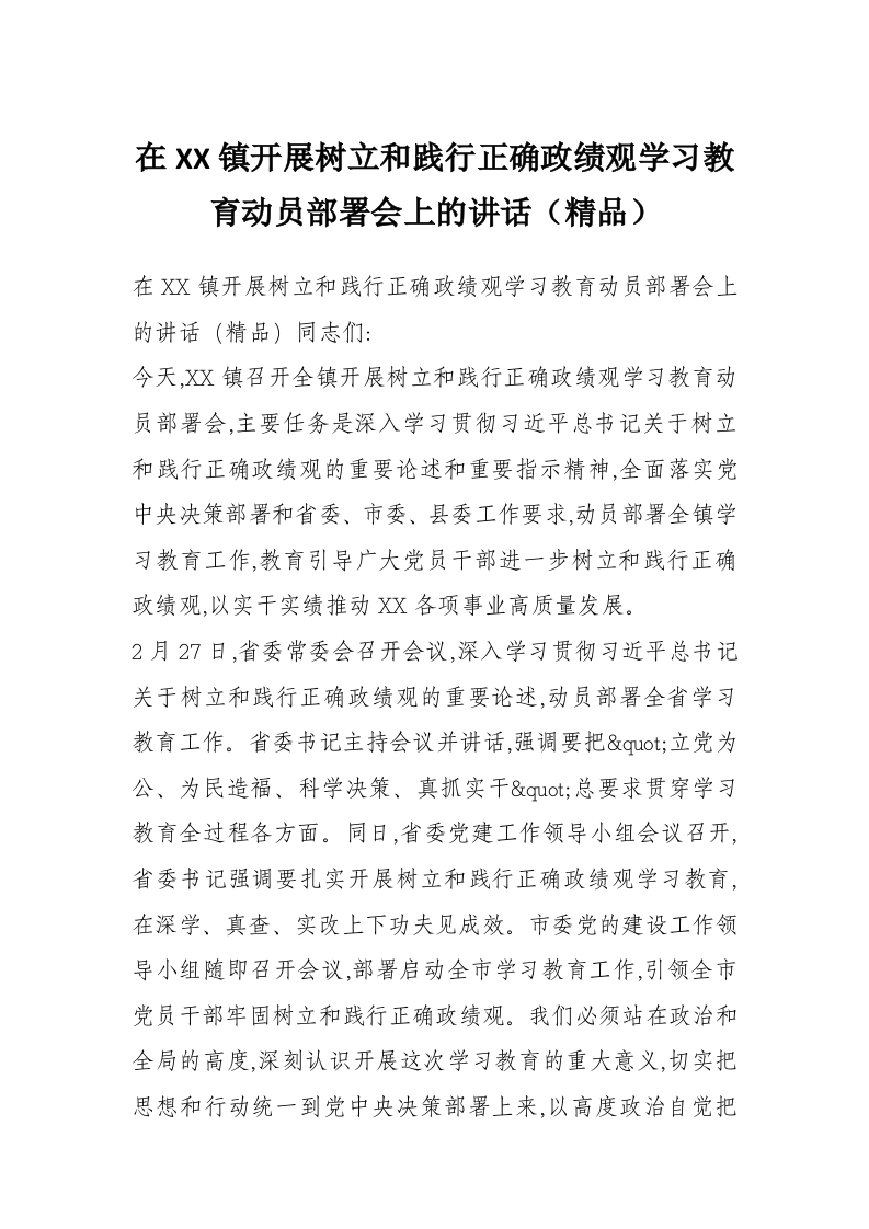 在XX镇开展树立和践行正确政绩观学习教育动员部署会上的讲话(精品)