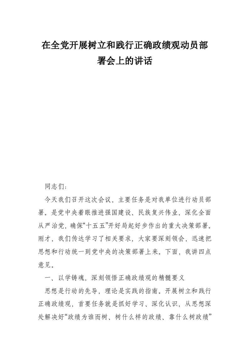 在全党开展树立和践行正确政绩观动员部署会上的讲话