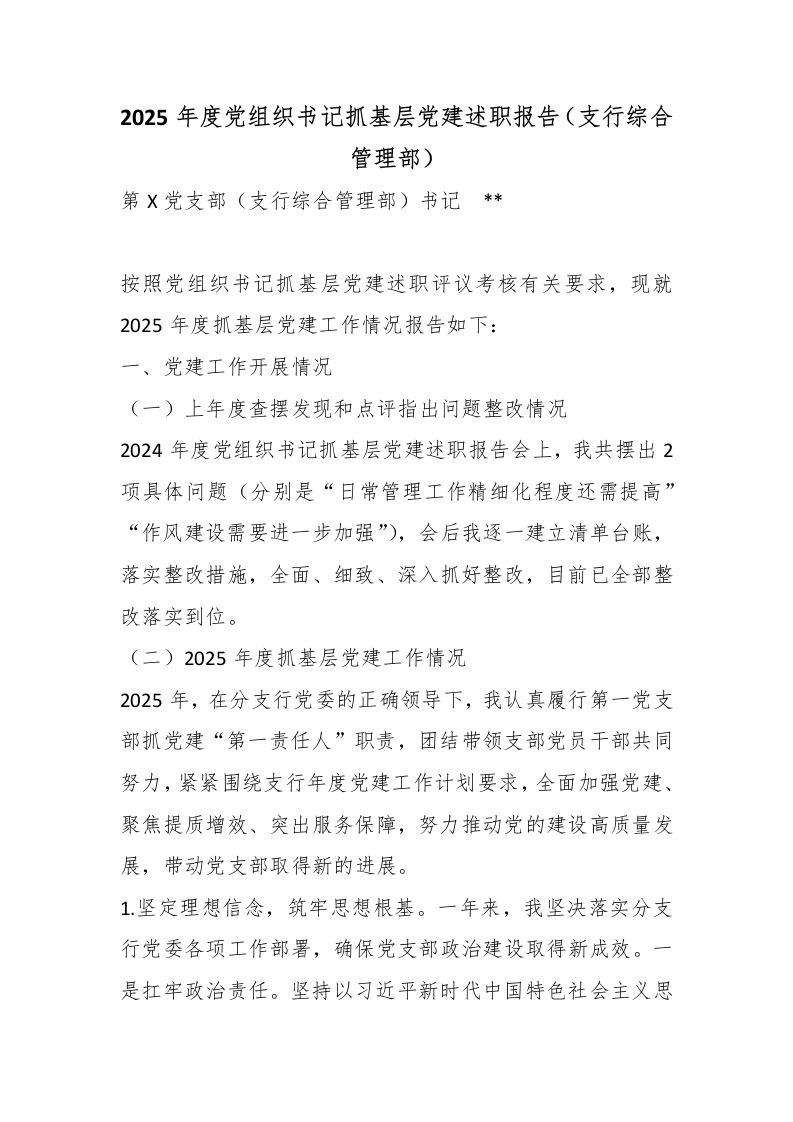2025年度党组织书记抓基层党建述职报告(支行综合管理部)