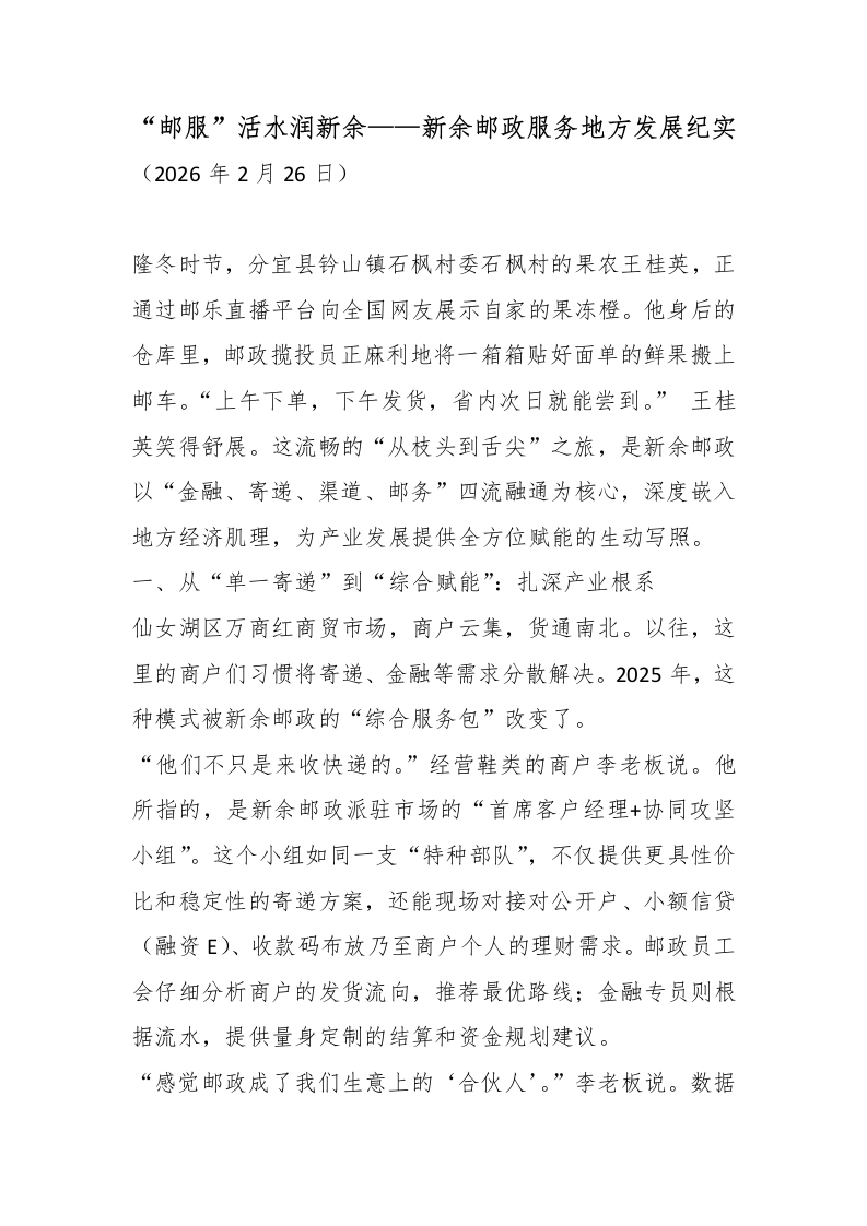 首页“邮服”活水润新余——新余邮政服务地方发展纪实