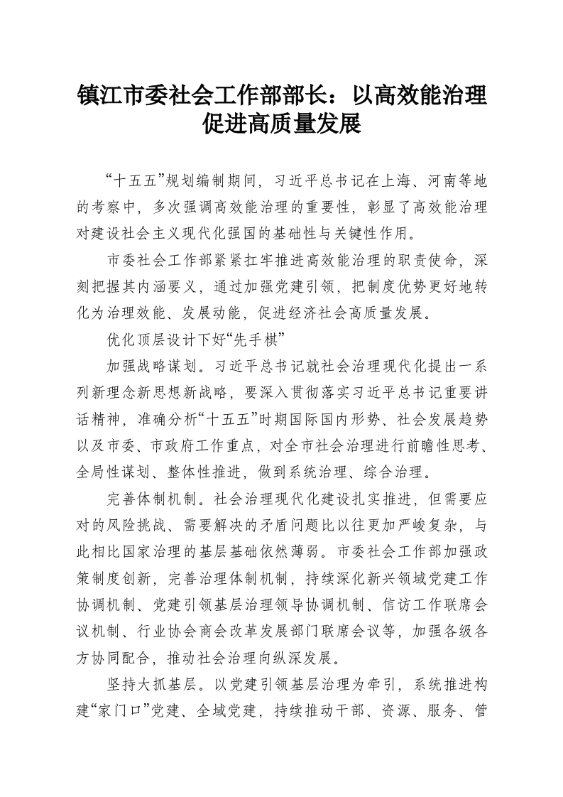 镇江市委社会工作部部长:以高效能治理促进高质量发展