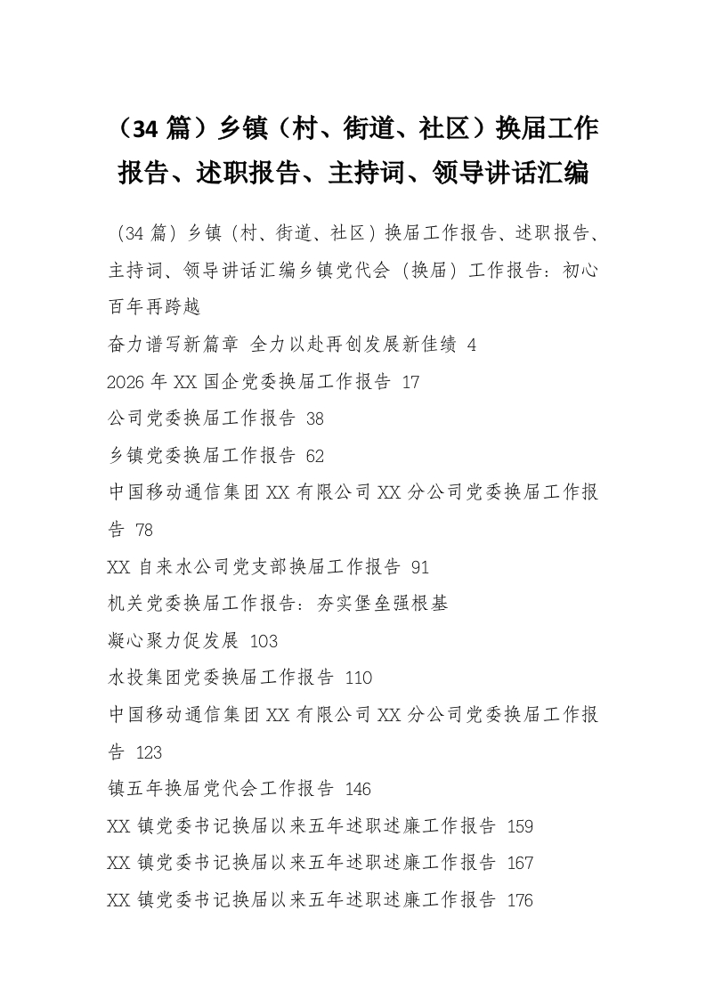 - (34篇)2026乡镇(村、街道、社区)换届工作报告、述职报告、主持词、领导讲话汇编